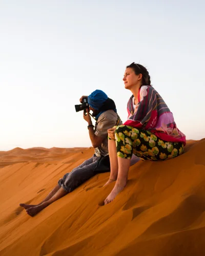 Capture stunning photos as the sun sets over the golden desert.